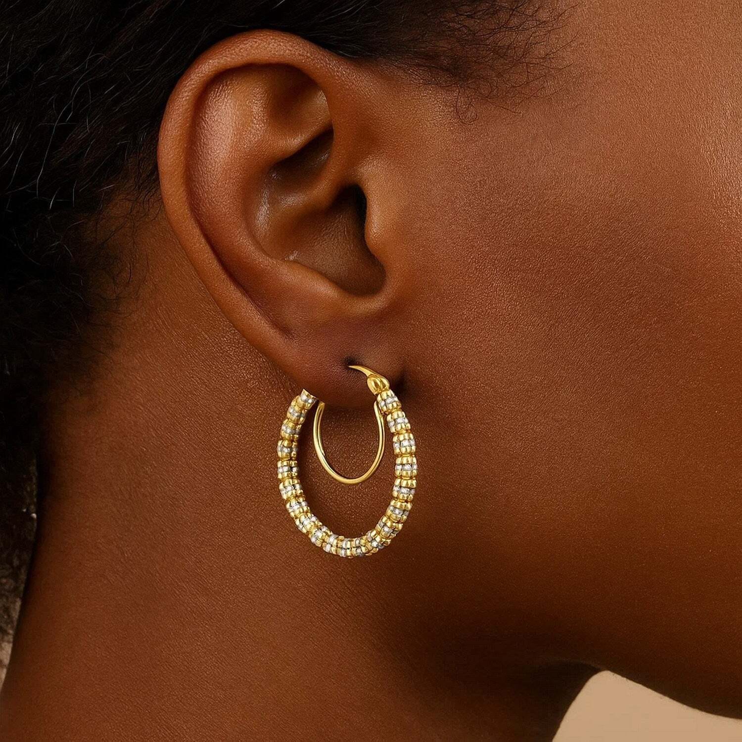 Perfect for adding a touch of bold bling, these 14k two-tone gold iced round hoop earrings are a stunning blend of texture and design. Featuring a diamond-cut, textured beaded finish, the larger two-toned hoop elegantly encircles a smaller gold hoop, creating a dynamic and eye-catching look.