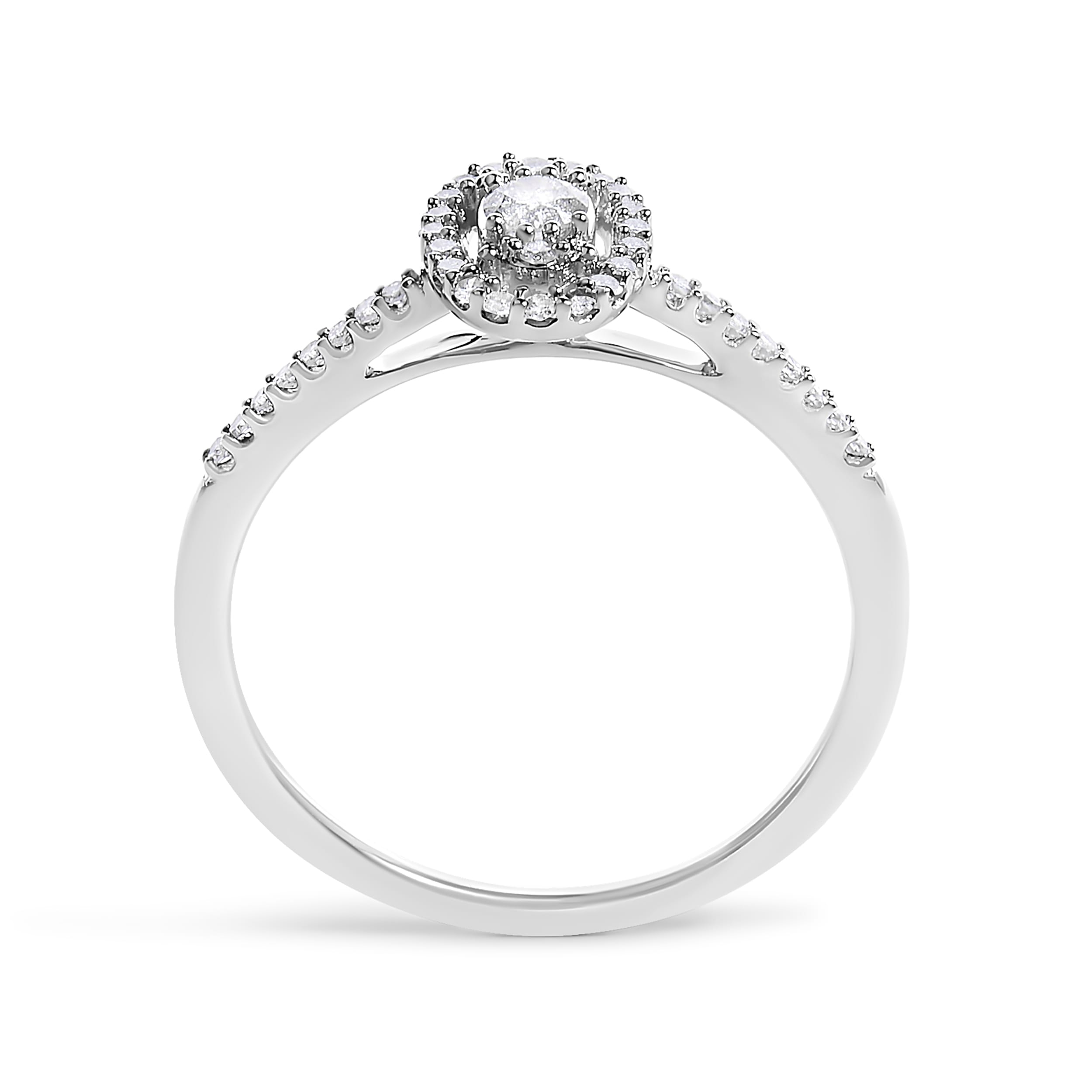 A masterpiece of delicate craftsmanship, this engagement ring is wrought from lustrous 14K white gold, finished with a rhodium plating to amplify its radiant gleam. At its heart lies an enchanting oval-shaped diamond, weighing 1/10 of a carat, cradled by a halo of meticulously set, smaller diamonds that escalate the central stone’s inherent brilliance. Each diamond, natural and pure, sparkles with an H-I color grade and I1-I2 clarity, weaving a tapestry of light with every movement. The band, elegantly embellished with accent diamonds, wraps gracefully around the finger, offering a perpetual reminder of timeless elegance and boundless love. This ring, a symbol of devotion and beauty, is designed to enchant and endure, just like the love it’s meant to celebrate.