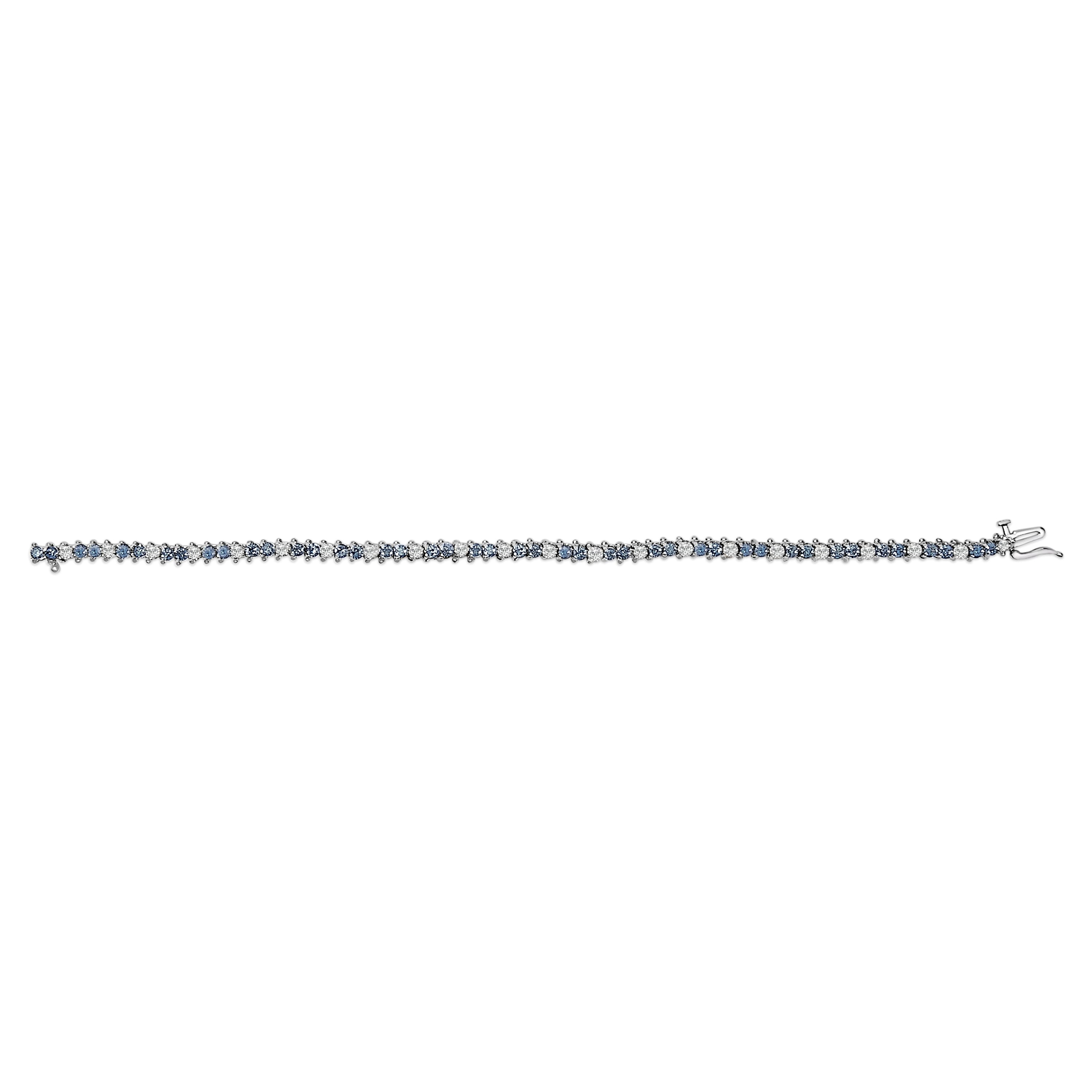 Draped in the luxury of 14K white gold, enhanced with rhodium plating, this tennis bracelet is a parade of precision and allure, featuring a striking symphony of 4 5/8 carats of round white and color-treated blue diamonds. Swathed in a 3-prong martini setting, each gemstone stands out with breathtaking clarity (I1-I2) and color (H-I), secured by a robust box clasp and latch tailored for a seamless fit up to 7 inches. The natural origin of both the untreated white diamonds and the enchanting blue diamonds, artfully treated to enhance their vivid hues, presents a testament to both nature’s bounty and human craftsmanship.