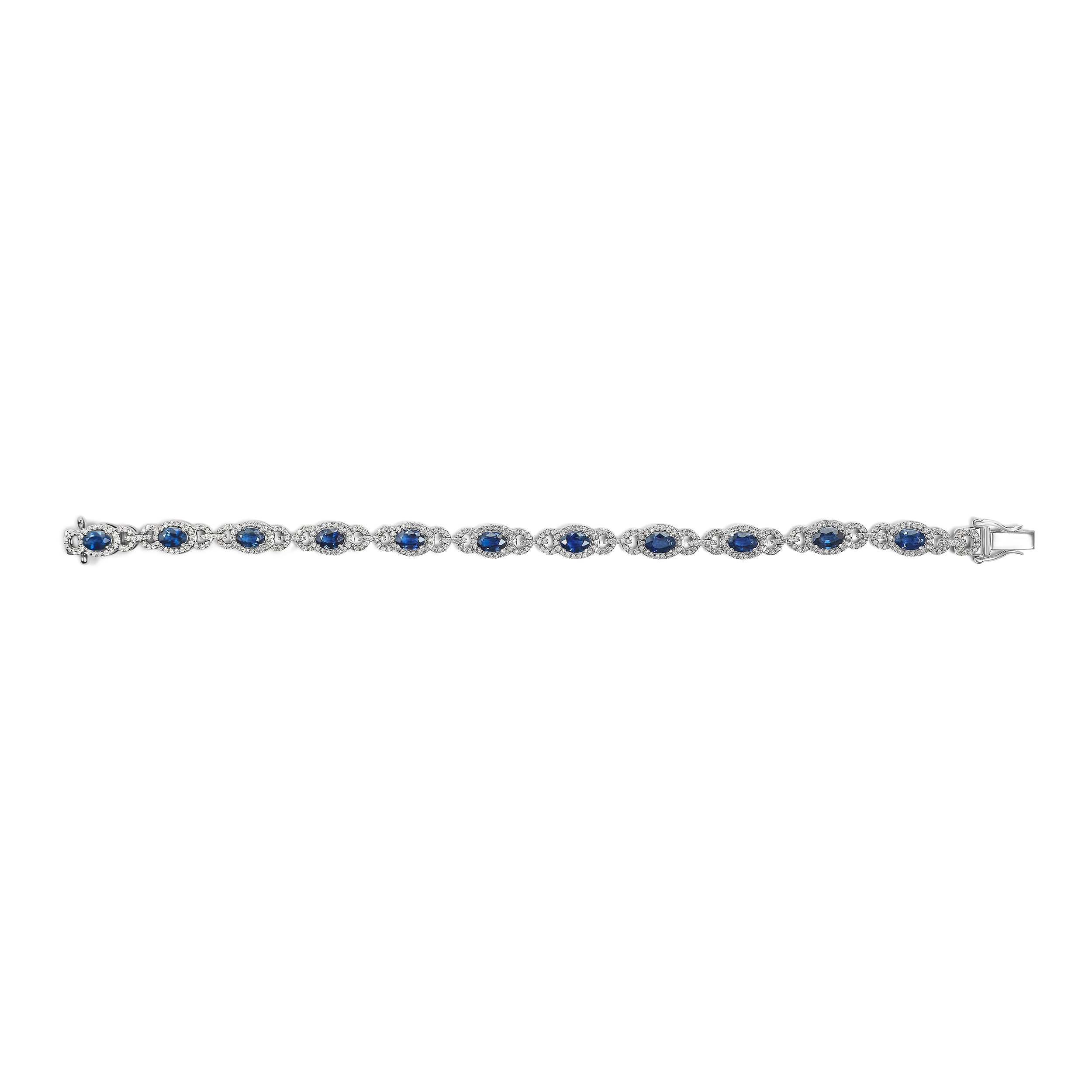 Crafted with masterful precision, this bracelet marries the timeless allure of 14k white gold, enhanced by a radiant rhodium plating, with the vibrant charm of natural, color-treated blue sapphires. Each sapphire, set in an elegant oval cut measuring 6×4 mm, gleams with an intense blue that promises to catch the eye and captivate the soul. Embracing these azure jewels are natural diamonds, 1 4/8 cttw, their round cuts sparkling with an I-J color and SI2-I1 clarity, offering a dazzling contrast that highlights the deep, rich blue of the sapphires. This exquisite piece features a vintage-inspired link design that seamlessly fuses classic elegance with modern sophistication, secured comfortably with a box tongue and safety latch. Designed for wrists up to 7 inches, it is a testament to both high craftsmanship and luxurious style, perfect for those who cherish jewelry that tells a story while adding a touch of refined beauty to any ensemble.