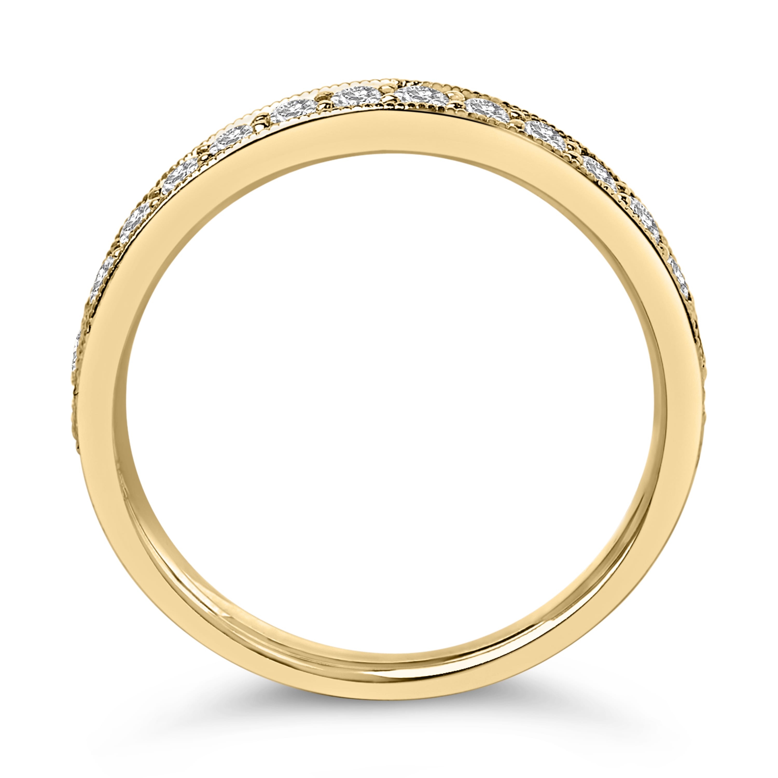 Imbued with timeless elegance, this 14k yellow gold wedding band gracefully celebrates matrimonial joy. Pave set across its forefront, 14 natural, round-cut diamonds shimmer with promises of eternal love, each boasting an I-J color grade and an SI2-I1 clarity that catches the light in a dance of dazzling brilliance. The distinct milgrain finish encircling each gem adds a vintage charm and intricate detail, enhancing the ring’s sophisticated allure. Perfect for those who treasure classic beauty combined with meticulous craftsmanship, this piece not only symbolizes unending love but also complements it with its exquisite refinement.