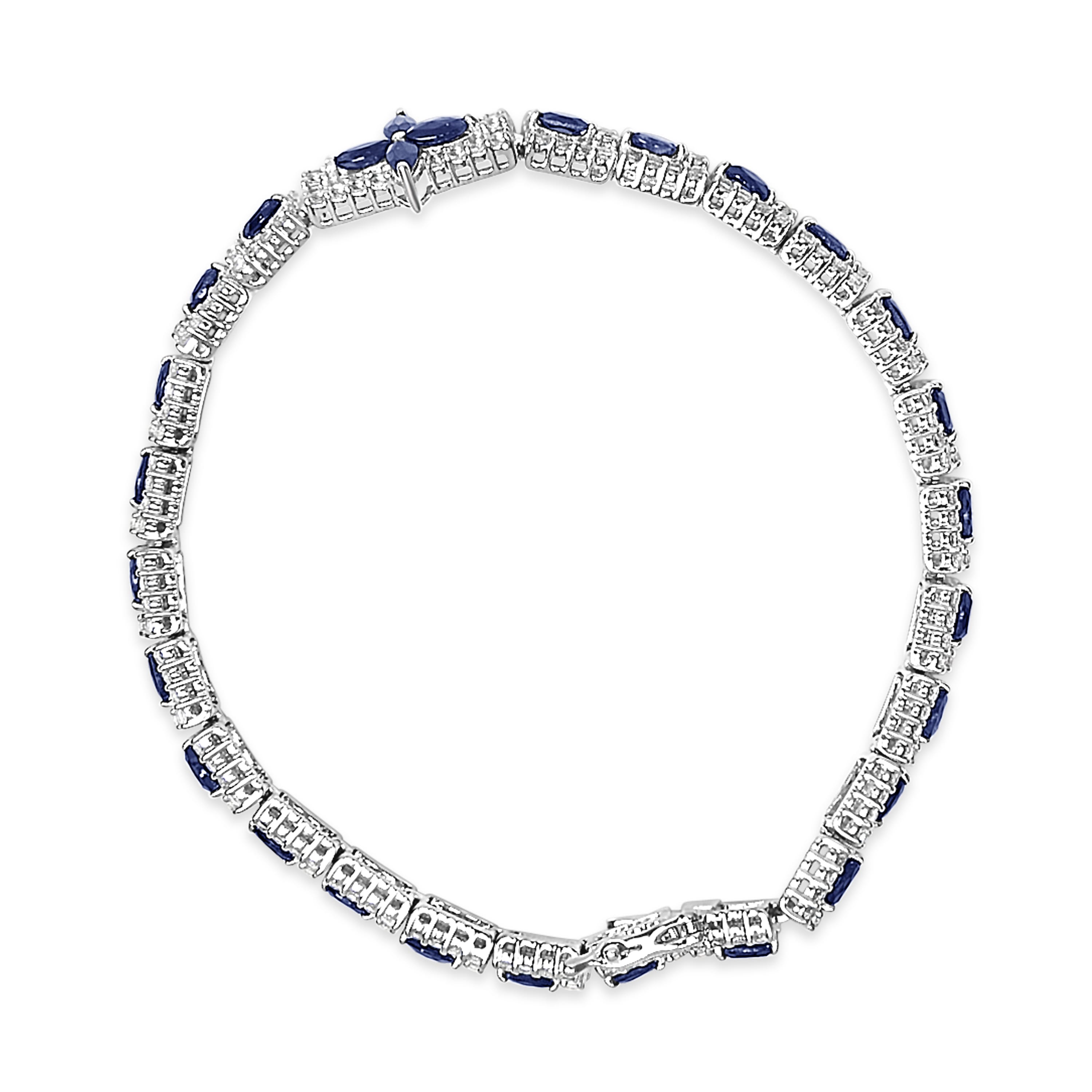 Experience the elegance of the Jazz Age with this exquisitely crafted rhodium-plated .925 sterling silver bracelet, a masterpiece featuring rich, heat-treated dark blue sapphires and natural white topaz. This luxurious piece blends the grandeur of Art Deco with modern craftsmanship, presenting a marquise floral design that captivates and enthralls. Each sapphire, masterfully cut into marquise shapes, ranging from the striking 5×2.5 mm stones at the center to the delicate 1.5×1 mm stones interspersed throughout, expresses a depth of color so intense it borders on the nocturnal. Embraced by twinkling topaz, these gems are secure and showcased in an intricate link pattern that comfortably fits wrists up to 7.5 inches, fastened with a reliable box clasp. This bracelet is not just an accessory but a statement of timeless luxury that beckons one to revel in life’s exquisite moments.